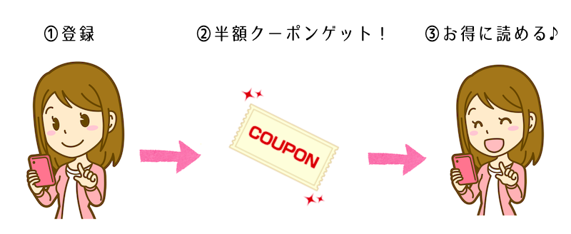 半額クーポンや定期的に発行される割り引きクーポンもあるのでお得に漫画を読むことができますよ!